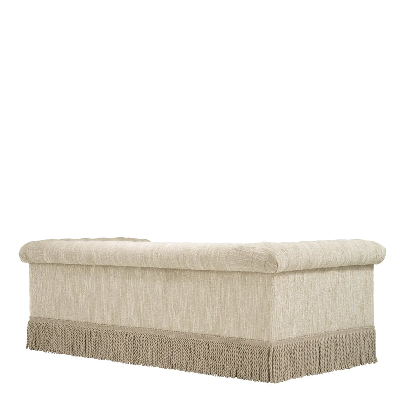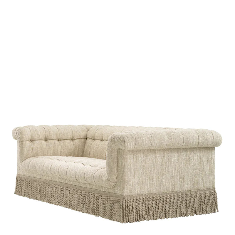Höj din inredning med den tidlösa elegansen hos soffan Dorantes. Klädd i exklusivt bouclétyg i nyansen Sonata Cream, framhäver den en sofistikerad tuftad design med eleganta fransdetaljer. Ett ikoniskt mästerverk som förenar komfort och estetik – och blir ett självklart inslag i varje lyxig interiör.